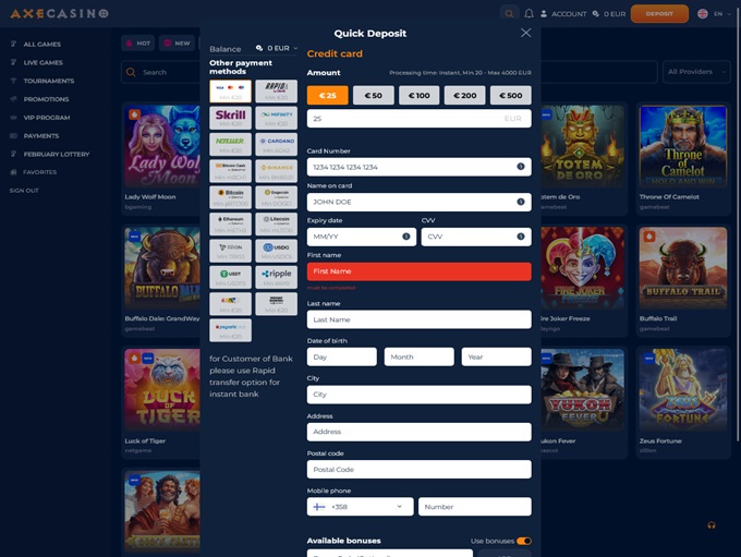 Yli 30 talletus- ja yli 25 kotiutusmenetelmällä AxeCasino tekee pankkiasioista helppoa. Kryptovaluutat ovat yksi tärkeimmistä valinnoista perinteisten vaihtoehtojen, kuten Visan, Mastercardin, Skrillin, Netellerin, Interacin ja pankkisiirtojen, rinnalla.