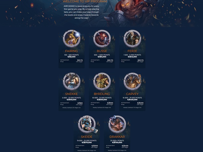 Monitasoinen VIP-ohjelma tarjoaa laajenevia etuja, kuten käteispalautuksia, korkeampia nostorajoja, syntymäpäivälahjoja ja eksklusiivisia turnauksia. Pisteitä ansaitaan tasaisella pelaamisella, ja ne voidaan vaihtaa bonuksiin. Mitä enemmän pelaat, sitä korkeammalle tasolle nouset. Tasoja on kahdeksan, mikä on erittäin houkuttelevaa ja motivoivaa AxeCasinon uskollisille asiakkaille.