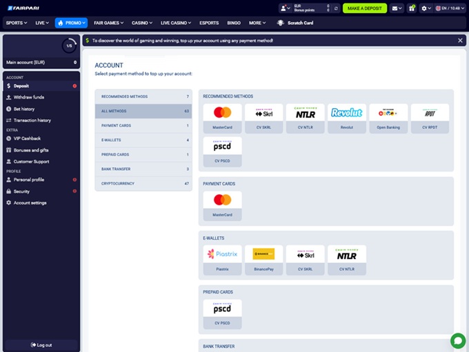 Pelaajat voivat valita sekä fiat- että kryptovaluuttoja talletuksiin ja kotiutuksiin. FairPari kasinolla käytettävissä olevat maksutavat ovat: Bitcoin, Bitcoin cash, Solana, Dogecoin, Master Card, Skrill ja monet muut maksupalveluntarjoajat.