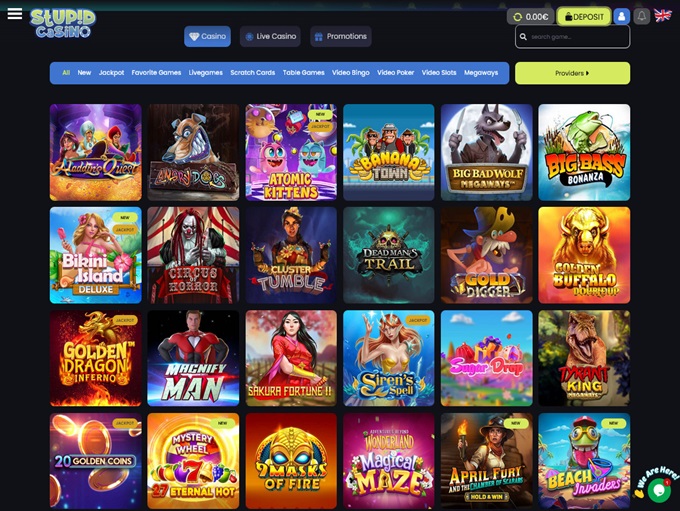 Stupid Casinolla on tuhansia nimikkeitä (listattu yli 8 000) kymmeniltä tarjoajilta, kuten Endorphina, Evoplay, Evolution, Felt, Gaming Foxium, Fazi ja Fugaso.
